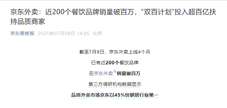 7月8日下午,京東黑板報宣布,京東外賣上線4個月已有近200個餐飲品牌在京東外賣銷量破百萬。