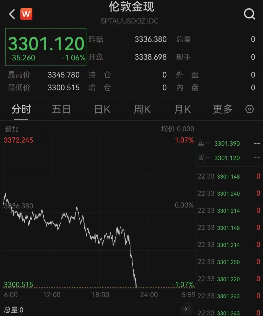 黃金則出現(xiàn)直線跳水,截至發(fā)稿,現(xiàn)貨黃金跌逾1%,挑戰(zhàn)3300美元/盎司,COMEX黃金跌超0.2%。