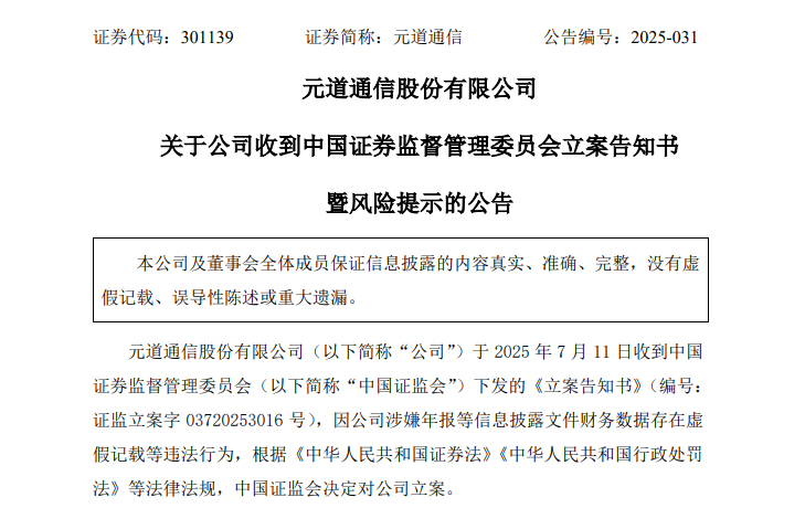 元道通信(301139)公告稱,公司于2025年7月11日收到中國證監(jiān)會下發(fā)的《立案告知書》,因公司涉嫌年報等信息披露文件財務(wù)數(shù)據(jù)存在虛假記載等違法行為,中國證監(jiān)會決定對公司立案。