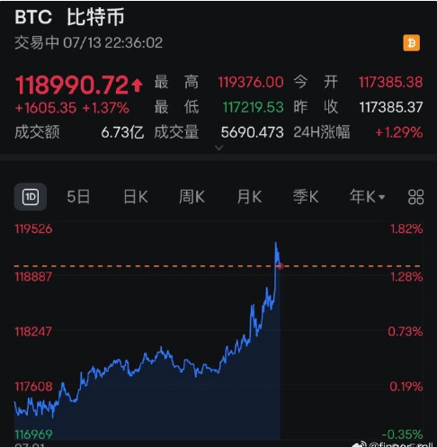 周日晚間,比特幣突然異動直線拉升,截至發(fā)稿,比特幣漲幅超1%。盤中一度突破119000美元,再創(chuàng)歷史新高。