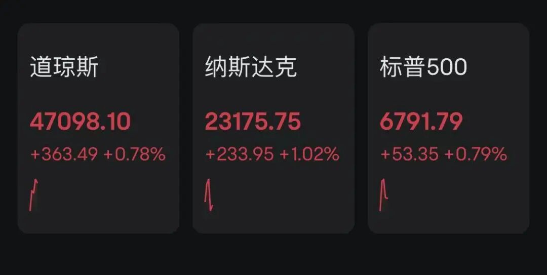 截至發(fā)稿,納指漲逾1%,道指漲近0.8%,標普500指數(shù)漲近0.8%。三大指數(shù)盤中均創(chuàng)歷史新高。